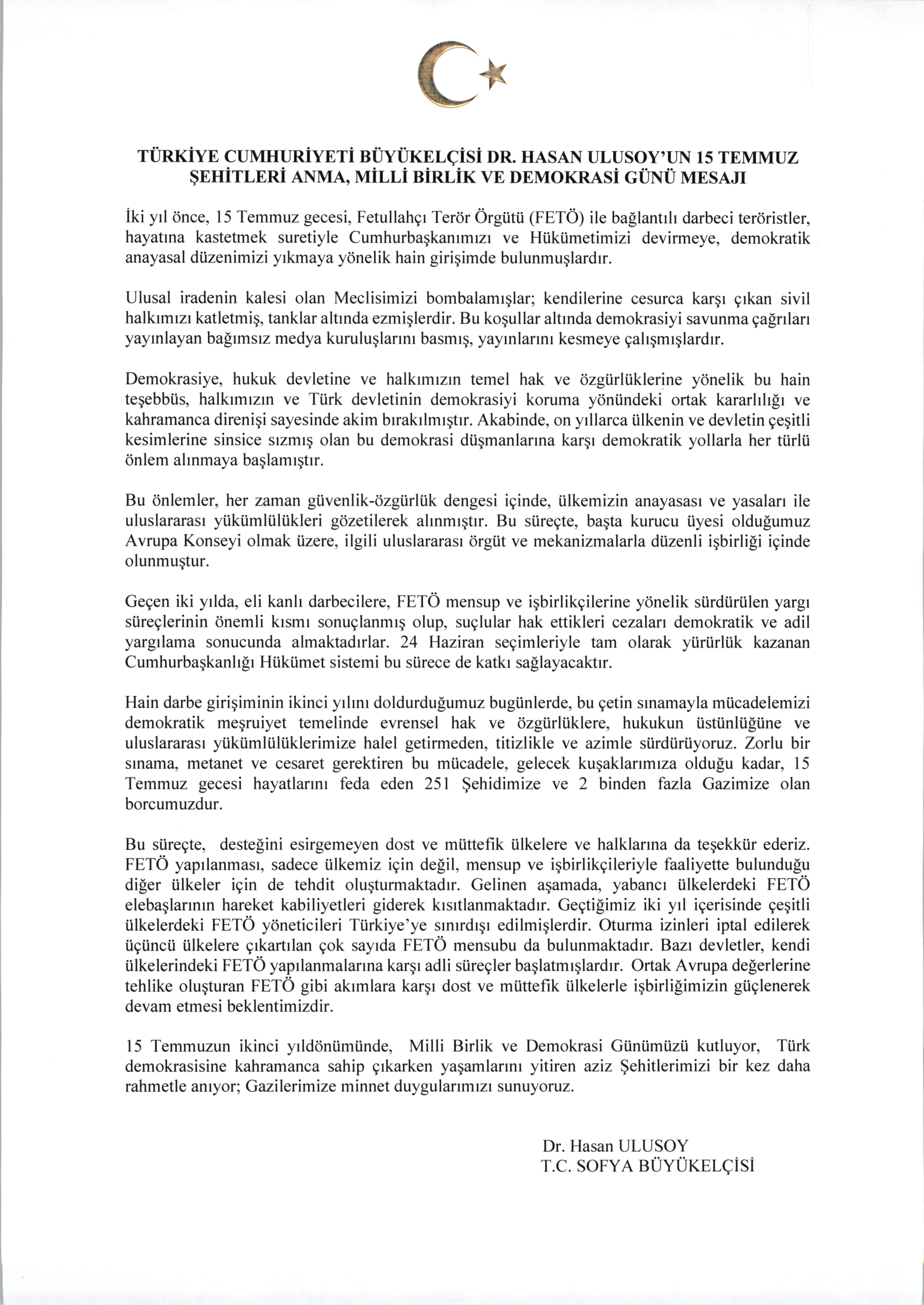 TÜRKİYE CUMHURİYETİ BÜYÜKELÇİSİ DR. HASAN ULUSOY’UN 15 TEMMUZ ŞEHİTLERİ ANMA, MİLLİ BİRLİK VE DEMOKRASİ GÜNÜ MESAJI