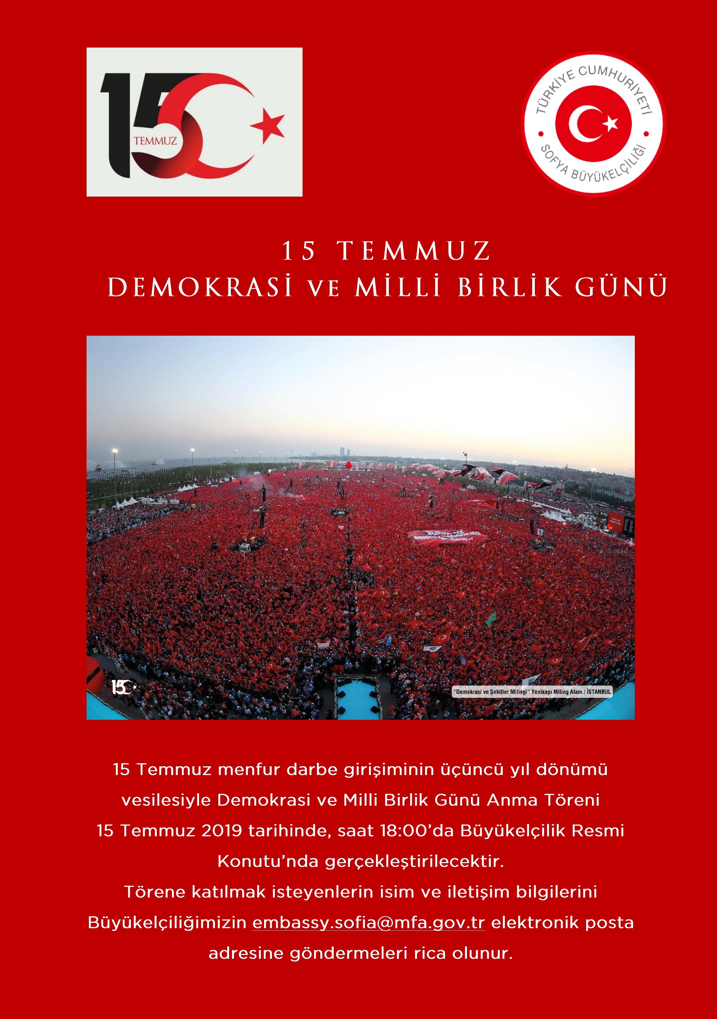 15 Temmuz menfur darbe girişiminin üçüncü yıl dönümü vesilesiyle Demokrasi ve Milli Birlik Günü Anma Töreni 15 Temmuz 2019 tarihinde, saat 18:00’da Büyükelçilik Resmi Konutu’nda gerçekleştirilecektir.