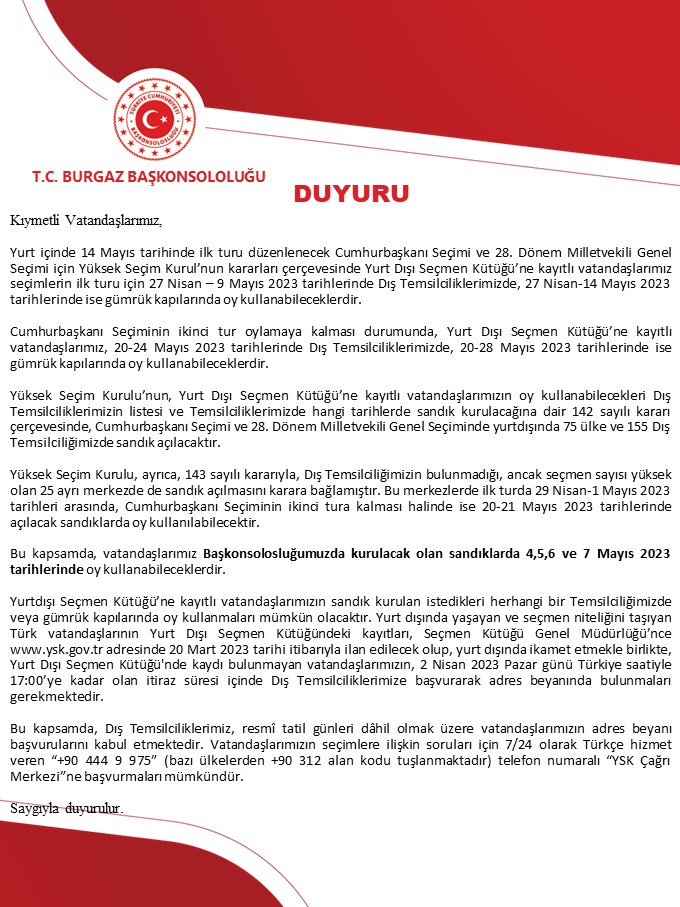 Yurt içinde 14 Mayıs tarihinde ilk turu düzenlenecek Cumhurbaşkanı Seçimi ve 28. Dönem Milletvekili Genel Seçimi için Yüksek Seçim Kurul’nun kararları çerçevesinde Yurt Dışı Seçmen Kütüğü’ne kayıtlı vatandaşlarımız seçimlerin ilk turu için 27 Nisan – 9 Mayıs 2023 tarihlerinde Dış Temsilciliklerimizde, 27 Nisan-14 Mayıs 2023 tarihlerinde ise gümrük kapılarında oy kullanabileceklerdir.